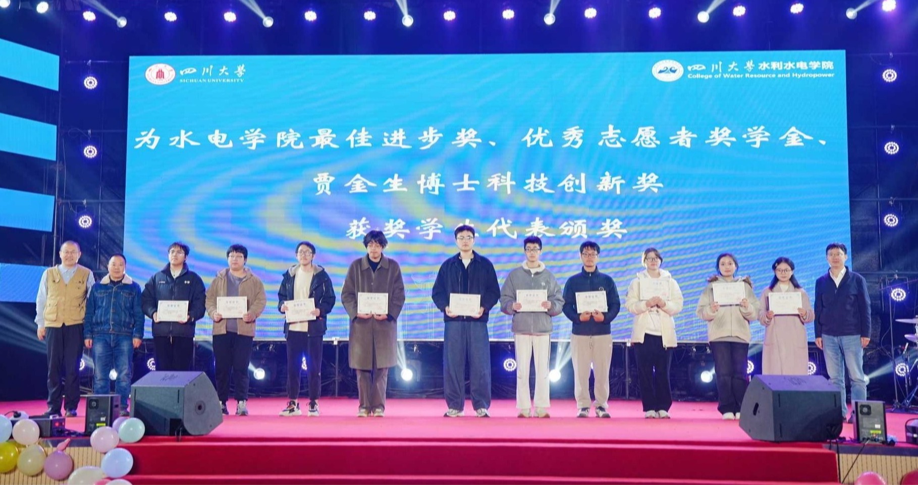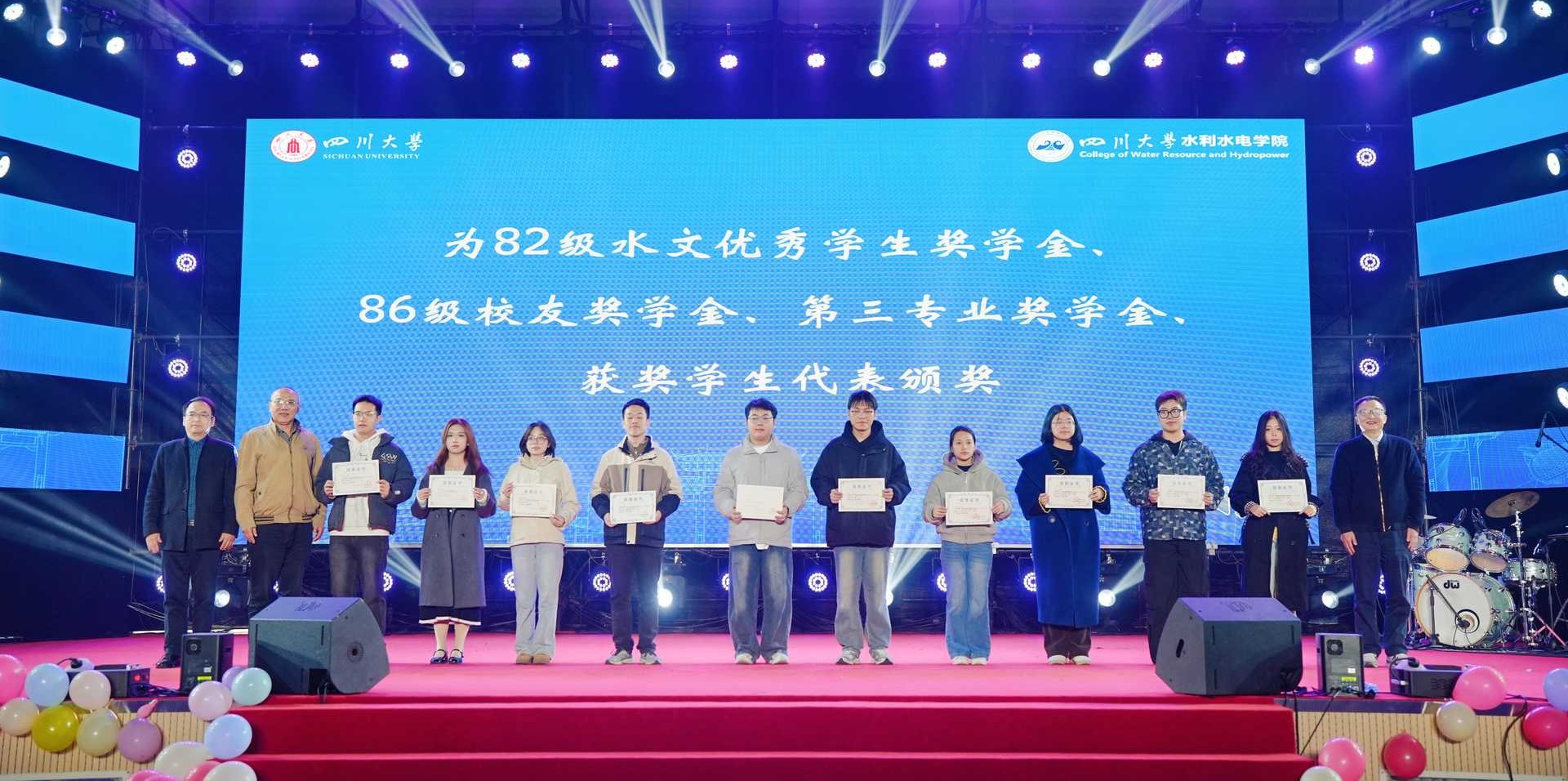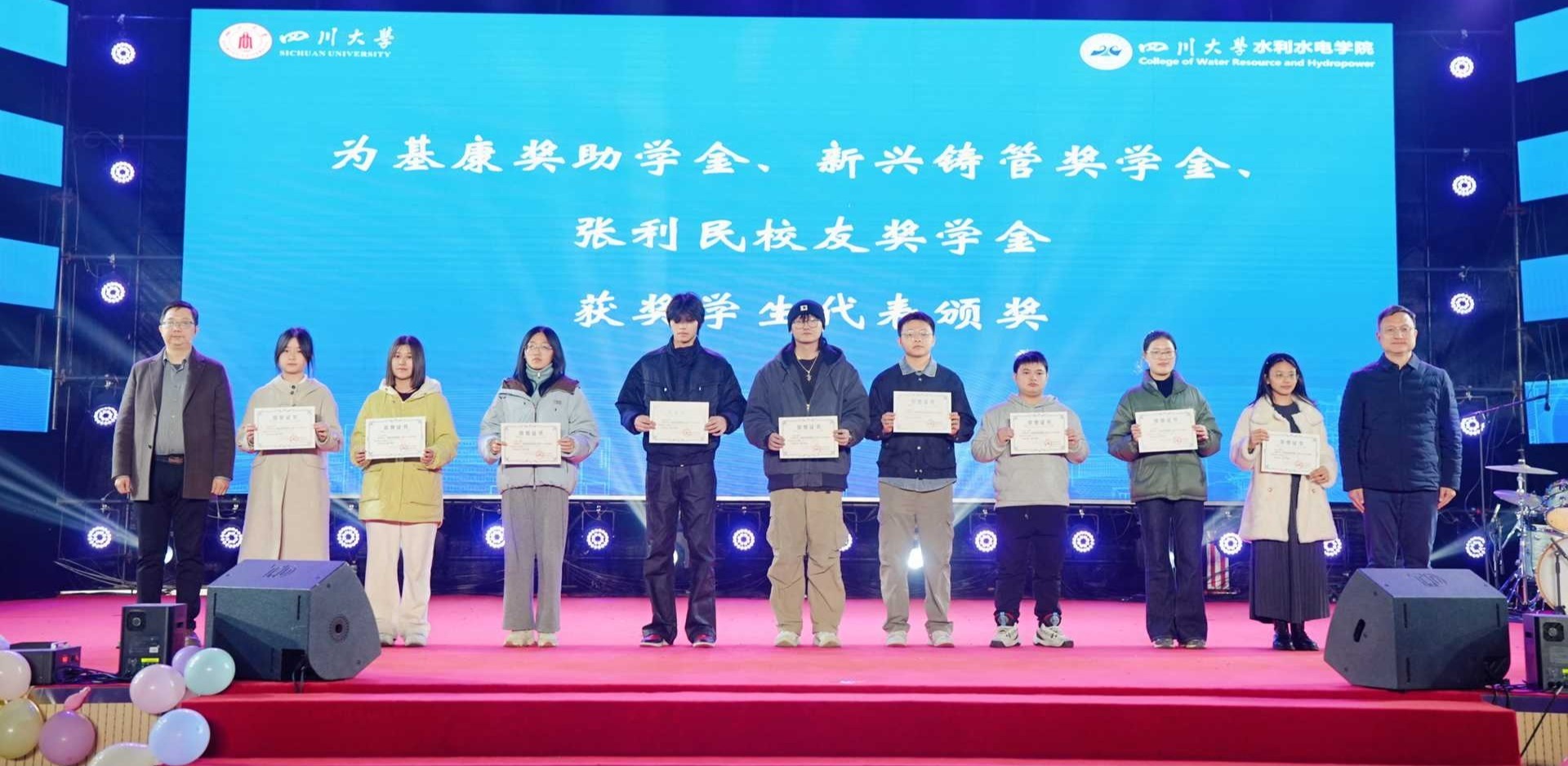 颁奖环节中,在场嘉宾与同学们一同观看了学院社会类助学金介绍视频。随后,吴刚、牟晋民为基康奖助学金、新兴铸管奖学金、张利民校友奖学金获奖学生颁奖;杨兴国、赵毅、江文清为86级水文优秀学生奖学金、86级校友奖学金、第三专业奖学金获奖学生代表颁奖;校友王东、邓元亮、周焕明为水电学院最佳进步奖、优秀志愿者奖学金、贾金生博士生科技创新奖获奖学生代表颁奖。