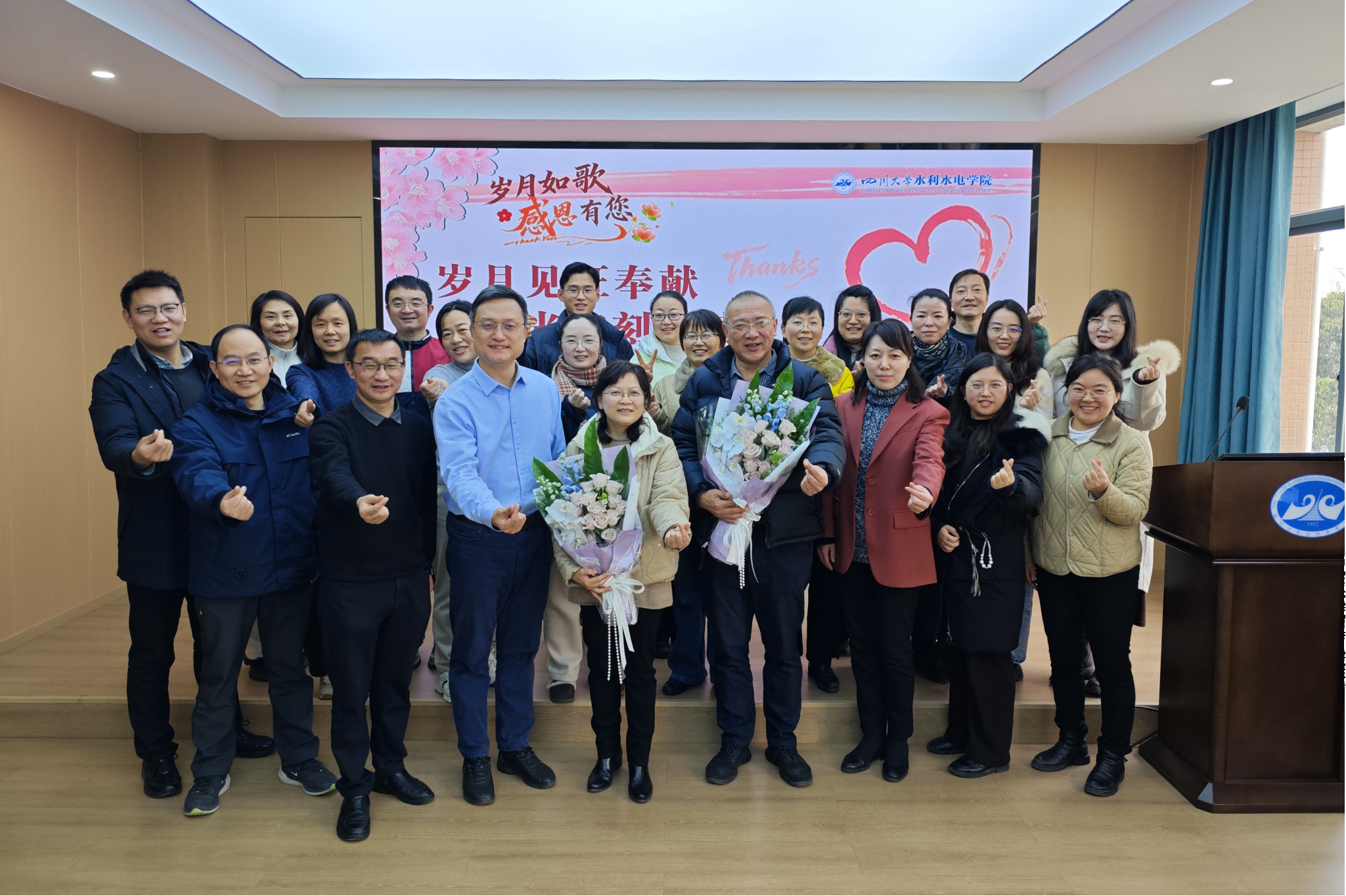 1月27日上午,学院在A331会议室隆重举行“岁月如歌,感恩有您”荣休教师欢送会。学院全体院领导、工会主席、党政管理科室全体人员齐聚一堂,共同为李渭新、赵毅两位老师奉献教育事业数十载的生涯献上荣退礼赞。会议由工会主席李洪涛主持。