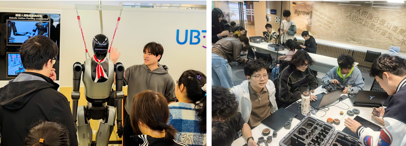 随后,创新实践团队前往香港优必选科技有限公司交流访问,深入了解该企业作为机器人领域龙头的发展历程、核心产品体系及其在工业领域的应用布局。通过专业人员的介绍讲解,团队成员学习了优必选科技与极氪汽车等企业的深度合作案例。在此基础上,团队成员开展实操训练,利用优必选科技提供的UGOT硬件,完成声音识别、面部识别、颜色识别,以及抓取、投放等动作编程,并结合工业实际需求完成技术适配。