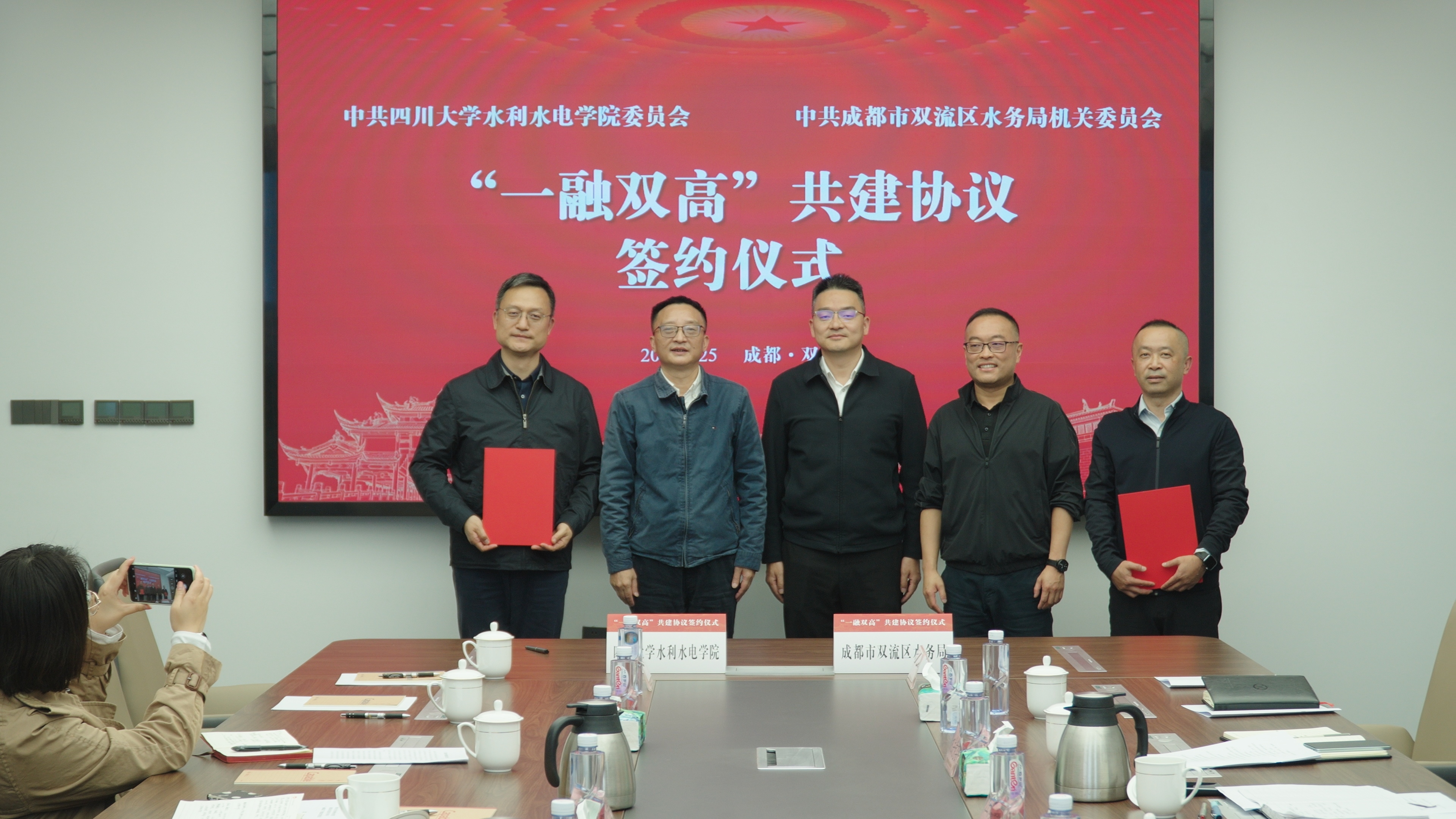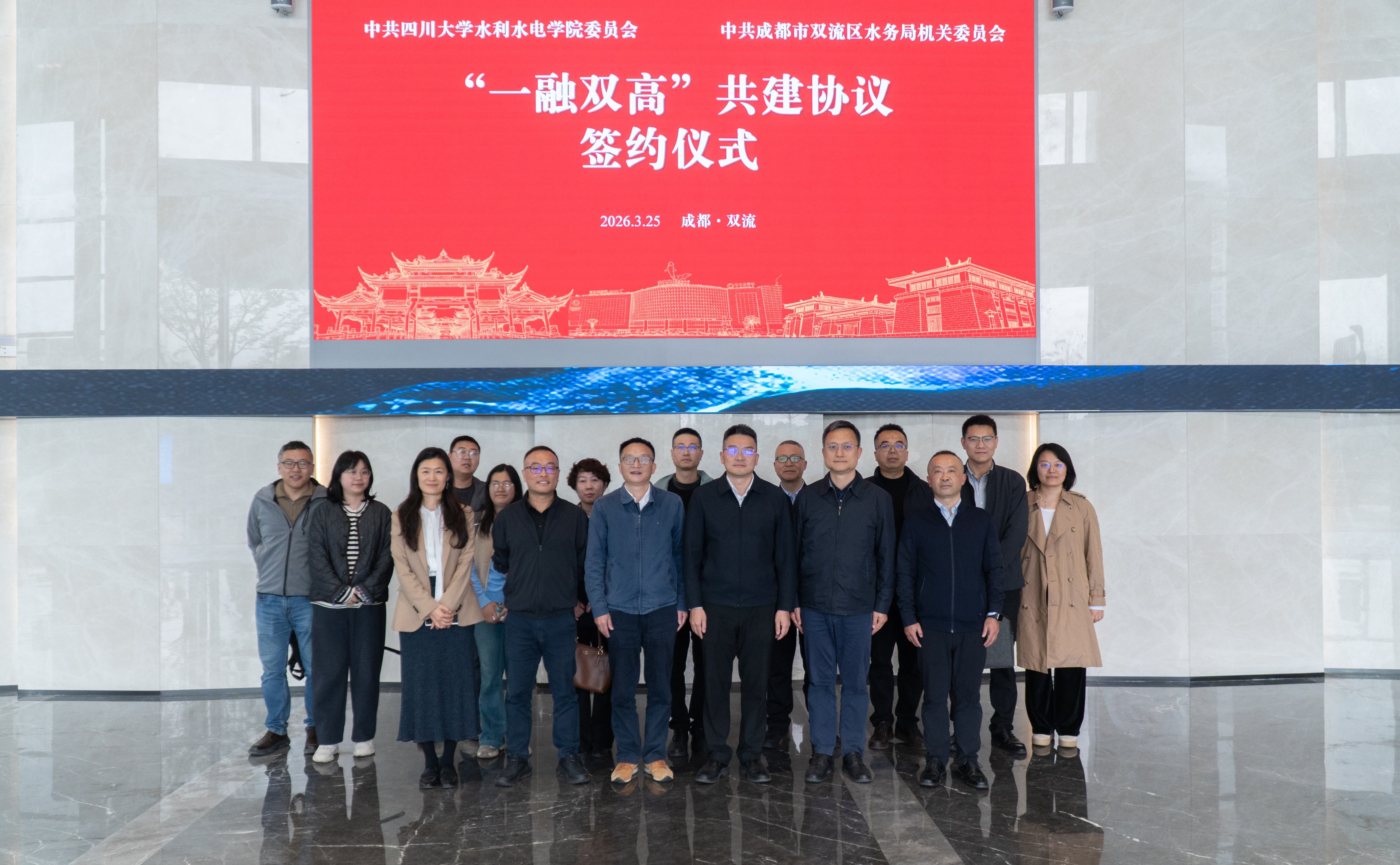 校地携手,共绘新篇。3月25日,学院与成都市双流区水务局签署“一融双高”共建协议。双流区委常委、区总工会主席苏巍,区政府党组成员、双流自贸试验区管理局专职副局长傅成曦,学院党委书记吴刚,院长杨兴国出席签约座谈会。